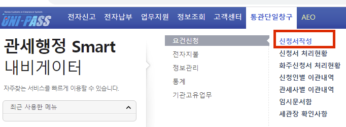 유니패스에 가입이 되었다고 가정하고 살펴보도록 하겠습니다. 일단 유니패스에 접속을 하여 공동인증서 로그인을 하고 아래 그림과 같이 통관단일창구 항목의 신청서작성 란을 클릭합니다.