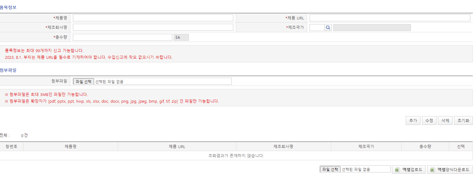 다 작성하였으면 첨부파일 부분 첫 번째 버튼인 '추가'를 누르면 본인의 작성 항목이 생성이 됩니다. 오류검증 버튼 한번 눌러보고 이상이 없으면 전송하면, 관세청 접수 - 식약처 검토 - 식약처 합격통보 이런 순으로 1~2일 내에 완료될 것입니다.