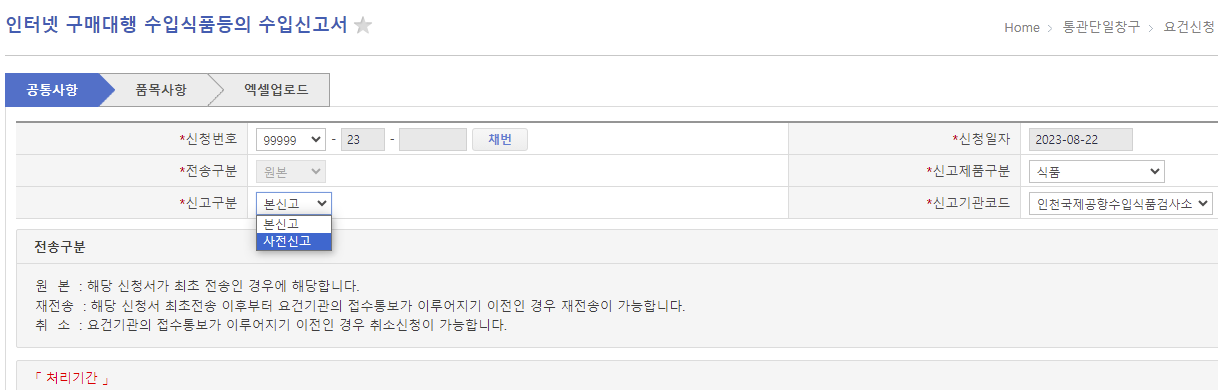 본신고와는 다르게 사전신고는 '신고일반' 부분이 비활성화됩니다. 왜냐면 아직 배송 전이므로 빨간 칸 안의 정보가 없기 때문입니다. 본 신고는 저 정보를 다 적어주어야 하는데, 사전신고는 그럴 필요가 없이 그냥 넘어가면 됩니다.