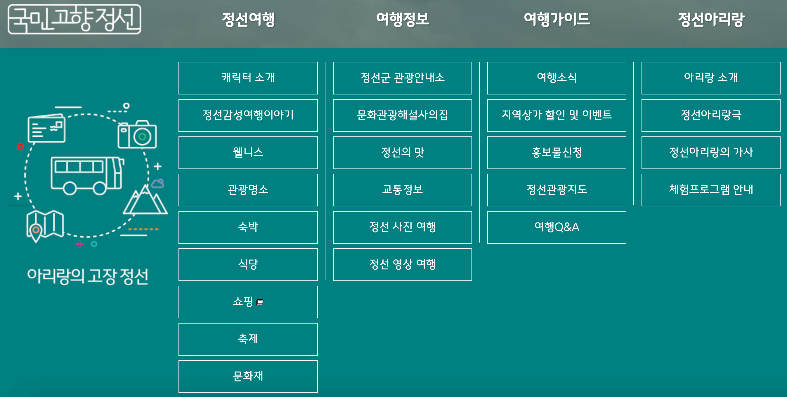 일단 큰 카테고리는 아래와 같이 한눈에 볼 수 있게 깔끔하게 되어 있습니다. 관에서 제공하는 사이트에서 정보를 얻기 위해서는 그간의 경험을 통해 한번에 쉽게 구조를 파악하고 원하는 정보를 얻기에 조금 어려웠었는데, 본 사이트에서는 정선 관광 콘텐츠가 많기도 하지만 정리를 잘해놓기도 해서 인지 사이트맵을 찾아볼 필요 없이 직관적으로 사이트 구조를 이해하고 바로 원하는 정보를 얻을 수 있게 되어 있습니다.