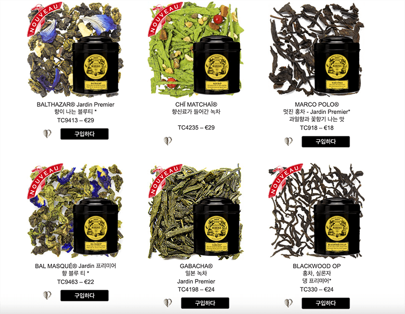 뭐 이런 식입니다. 다른 제품들도 대부분 홍차, 녹차 베이스에 이거 저거 요거 다 섞어서 새로운 맛 짜자잔 제품. 프랑스의 향수가 발달한 이유는 잘 씻지를 못해서 향이 발달했다고 알려져 있는데, 이 차산업에서도 역시 좋은 차는 다 영국에 뺏기고 등급이 낮은 차만 받다 보니 이 걸 희석시키려 가향차 산업이 발달한 건가 싶기도 할 정도로 안 섞인 제품보다는 섞인 제품력을 인정받아 세계를 누비고 있습니다.