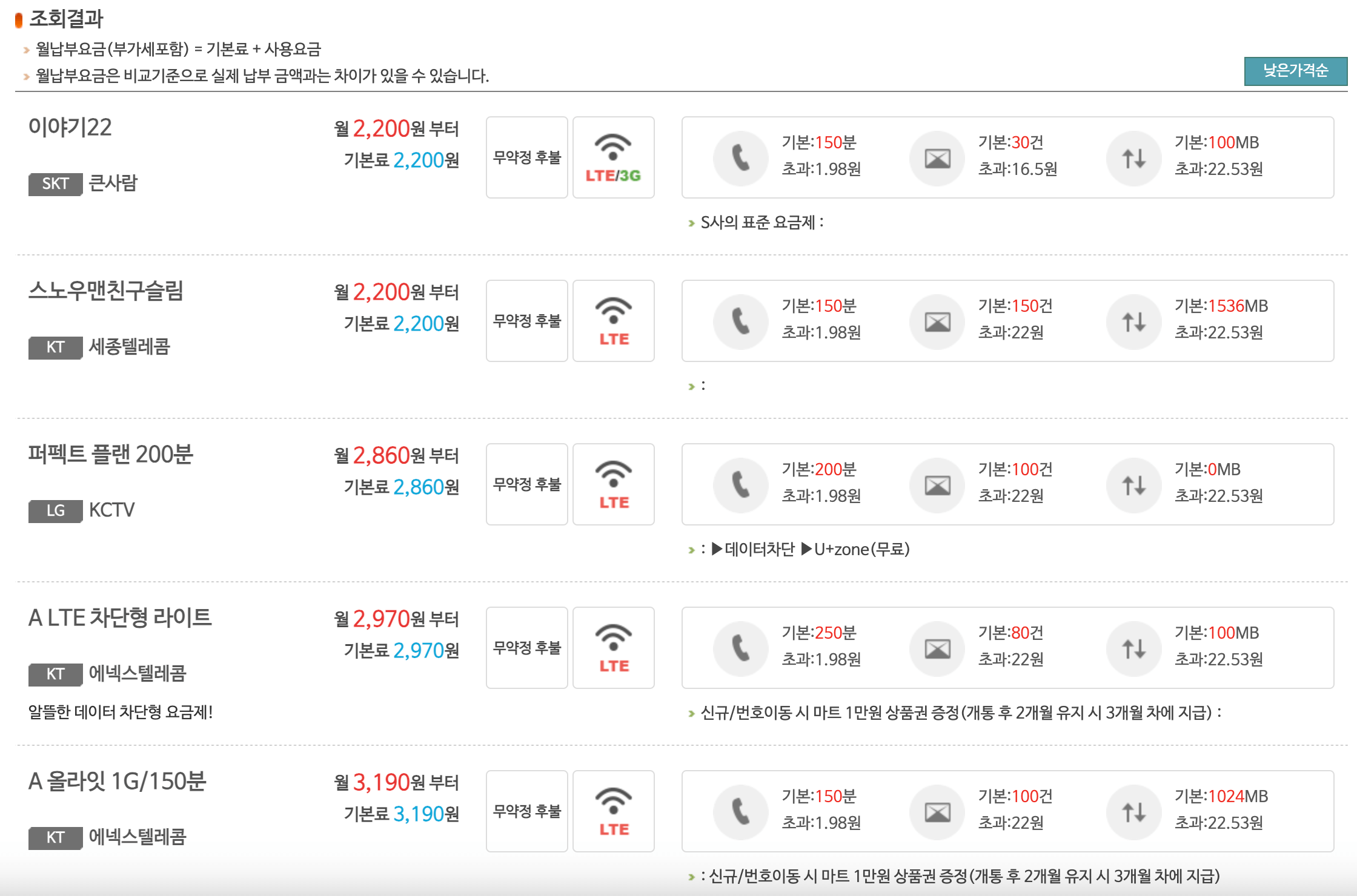 3. 예시로 단말기가 있는 경우 '내게 맞는 요금제 선택'을 클릭하시면 아래와 같이 상당히 저렴한 요금제를 볼 수가 있습니다. 이 중에 원하시는 상품을 선택하시면 됩니다.