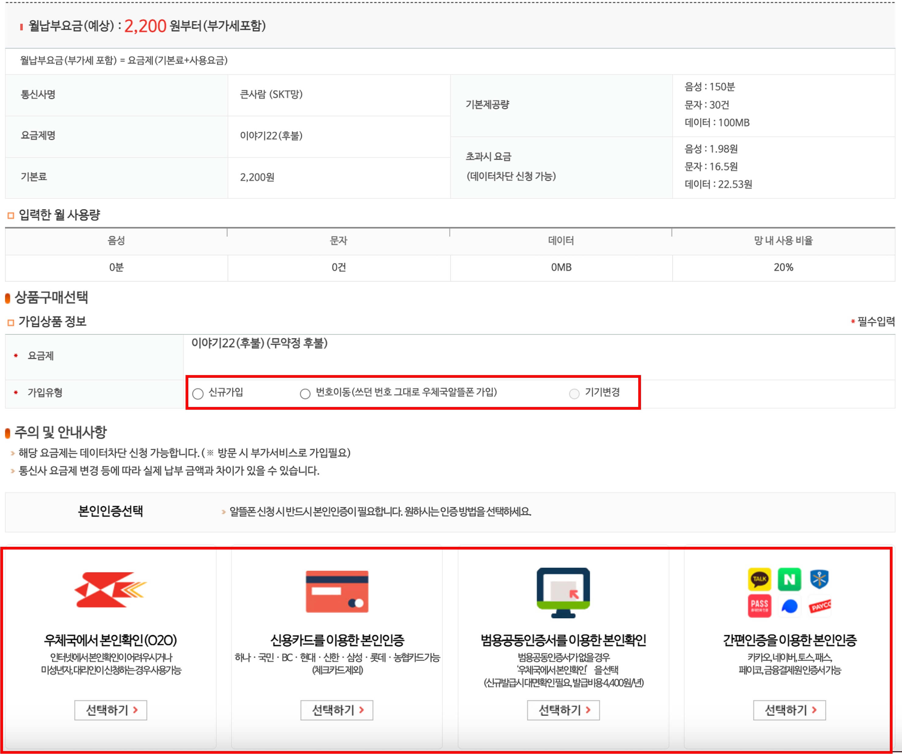 4. 상품을 선택하면 아래와 같이 가입유형을 선택하는 창이 나오게 되는데 각자의 상황에 맞게 신규가입, 번호이동, 기기변경 중에 고르시고, 인증은 편한 방법으로 진행하시면 되겠습니다.
